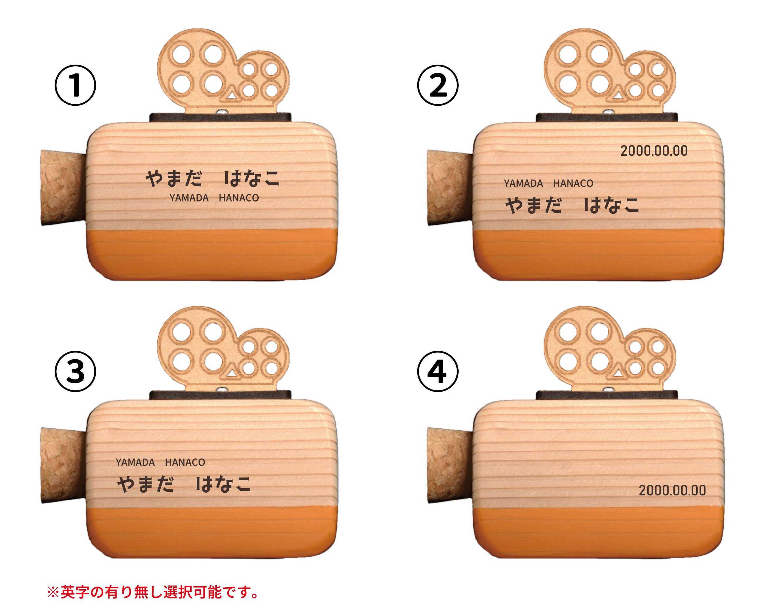 名前や日付を刻印することができ、デザインはテンプレートの4種から選ぶことが出来ます。